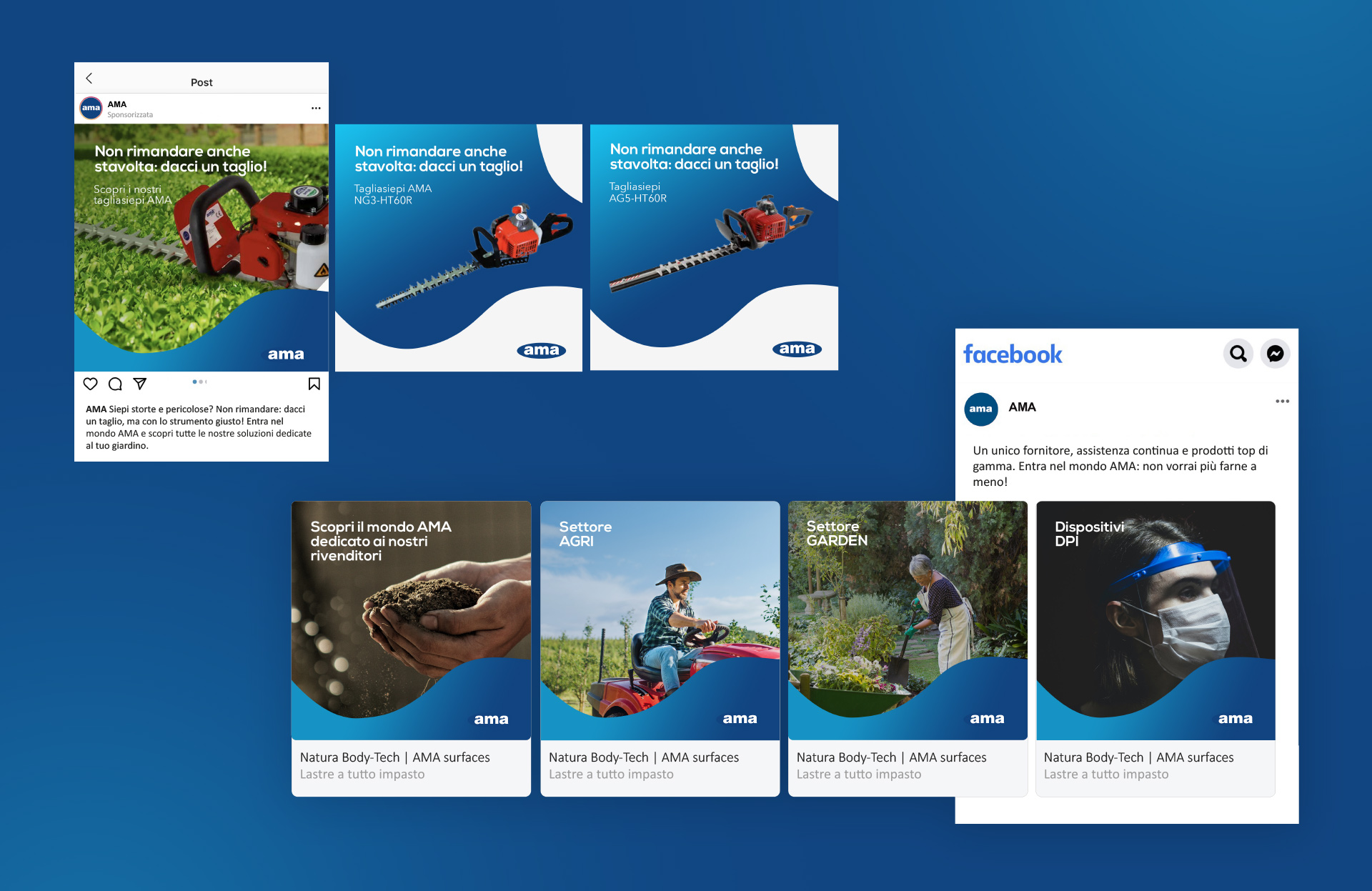 Allo scopo di rafforzare e ampliare la brand identity di AMA, abbiamo creato una nuova immagine coordinata digitale, declinandola su ogni social network coinvolto e posizionamento sfruttabile, sia dal punto di vista organico che di campagna.