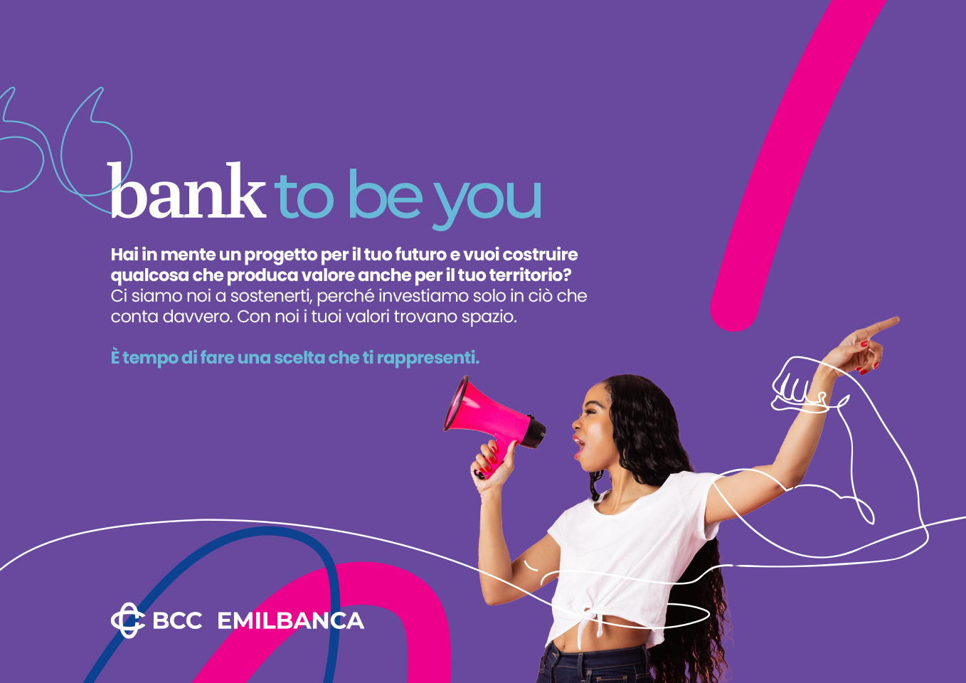 Partendo dal brief e dagli obiettivi forniti, l’Agenzia ha ideato naming e identità visiva del progetto, un nuovo sistema di comunicazione (comunicato attraverso una campagna ADV) e una strategia social dedicata: è nato così “Bank To Be”, un progetto pensato per parlare direttamente alle nuove generazioni con un linguaggio fresco, autentico e innovativo.