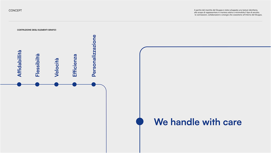 La nuova identità visiva che rappresenta il brand attraverso un concept ispirato al viaggio, inteso come metafora di un percorso ricco, flessibile e costruito su misura. Il nuovo linguaggio grafico si articola a partire dal marchio del Gruppo, da cui è stata sviluppata una texture identitaria che esprime, con eleganza e sobrietà, la complessità dei servizi offerti.